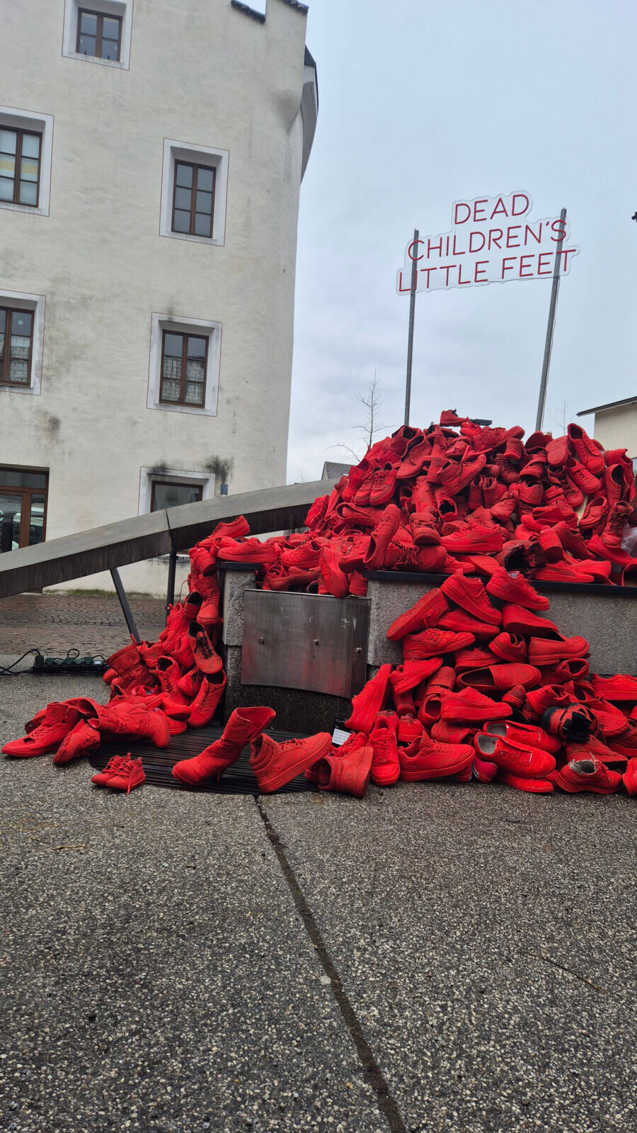 L’opera, ispirata alla poesia “Scarpette Rosse” di Joyce Lussu, è stata realizzata da 280 studenti delle scuole medie italiane e tedesche di Bressanone (A. Manzoni, M. Pacher e O.v.Wolkenstein). L’installazione si compone di quasi 500 scarpe, dipinte dai ragazzi durante le ore di arte, mentre in altre materie – come storia, educazione civica, religione e L2 – sono stati approfonditi i temi legati alla Shoah e all’importanza della memoria collettiva. Questo progetto, frutto di un lavoro collettivo, è un esempio tangibile di collaborazione e convivenza pacifica: ogni classe ha contribuito realizzando una parte dell’installazione, concepita come un grande puzzle. Solo nell’assemblaggio finale l’opera si è rivelata nella sua interezza, sottolineando simbolicamente che ognuno può fare la propria parte per costruire un futuro migliore.