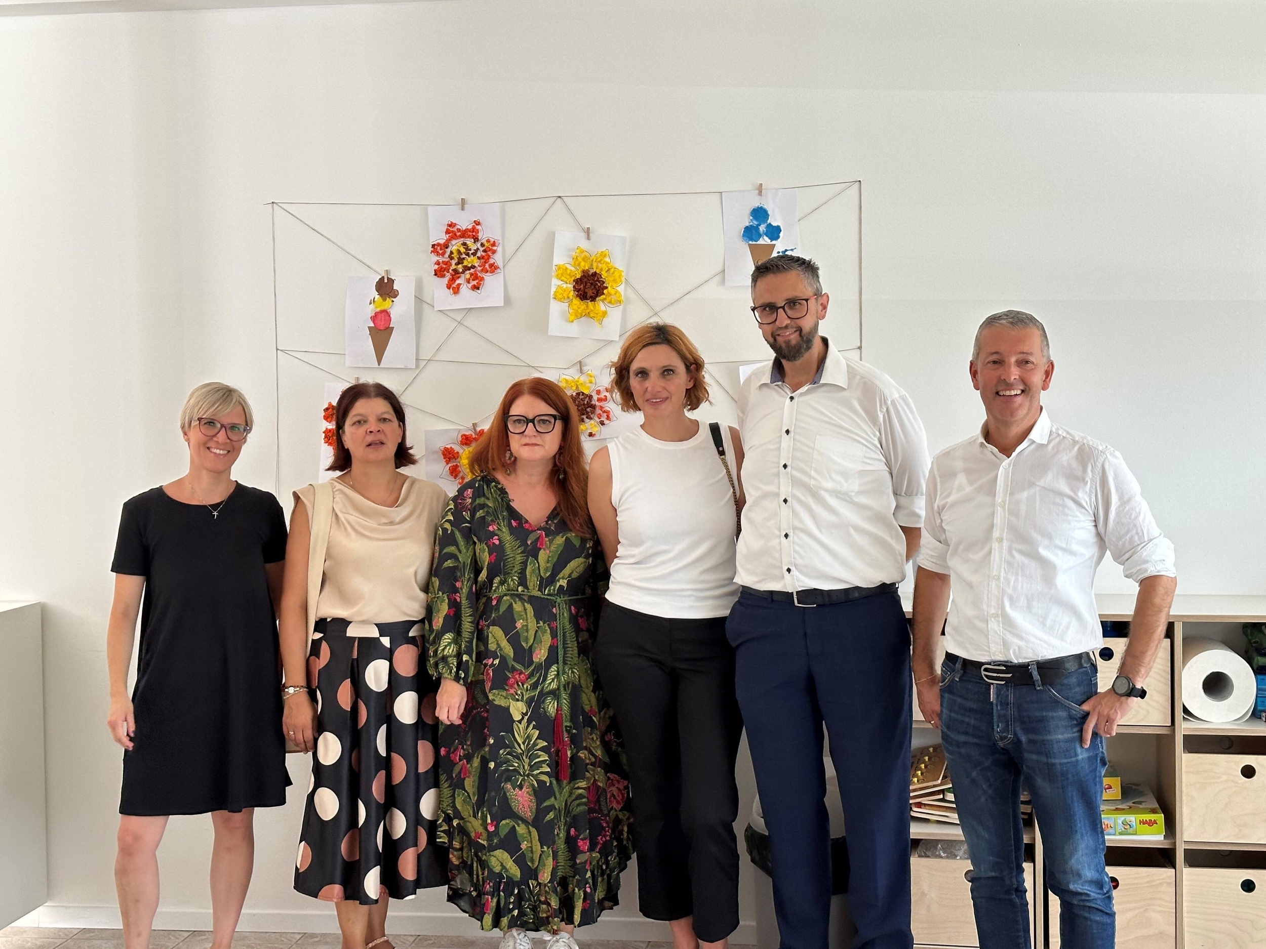 Foto: da sinistra a destra Marion Ladurner, Alessandra Scorrano, Petra Bisaglia, assessora comunale Monika Leitner, Stefan Hofer, Sindaco Peter Brunner
