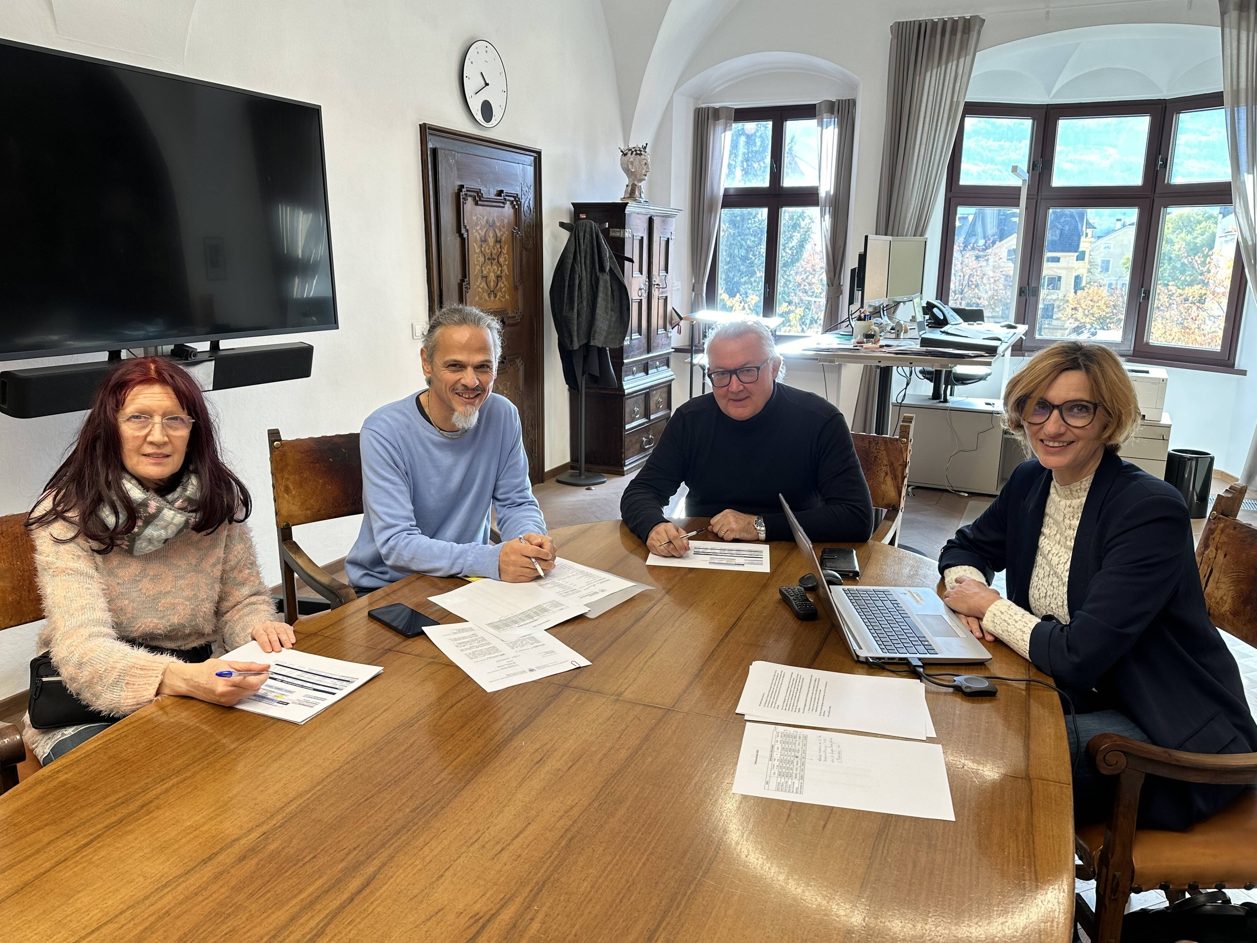 Nella foto (da sinistra a destra) Irene Masera, il capo dipartimento Hermann Popodi, il vicesindaco Ferdinando Stablum e l'assessore comunale responsabile Monika Leitner mentre pianificano le vacanze per anziani del 2024